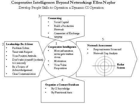 Below is a one-page Extreme Presentation that I prepared for SCIP’s 2007 Annual Conference, just after attending Dr. Andrew Abela’s Extreme Presentation workshop. My objective was to define what cooperative intelligence is, how it works, and how you win by using it. You will notice that there are about 5 “charts” contained in this one page, and that it is not flashy.  You can also tell by looking at the page that I will be talking about a process.
